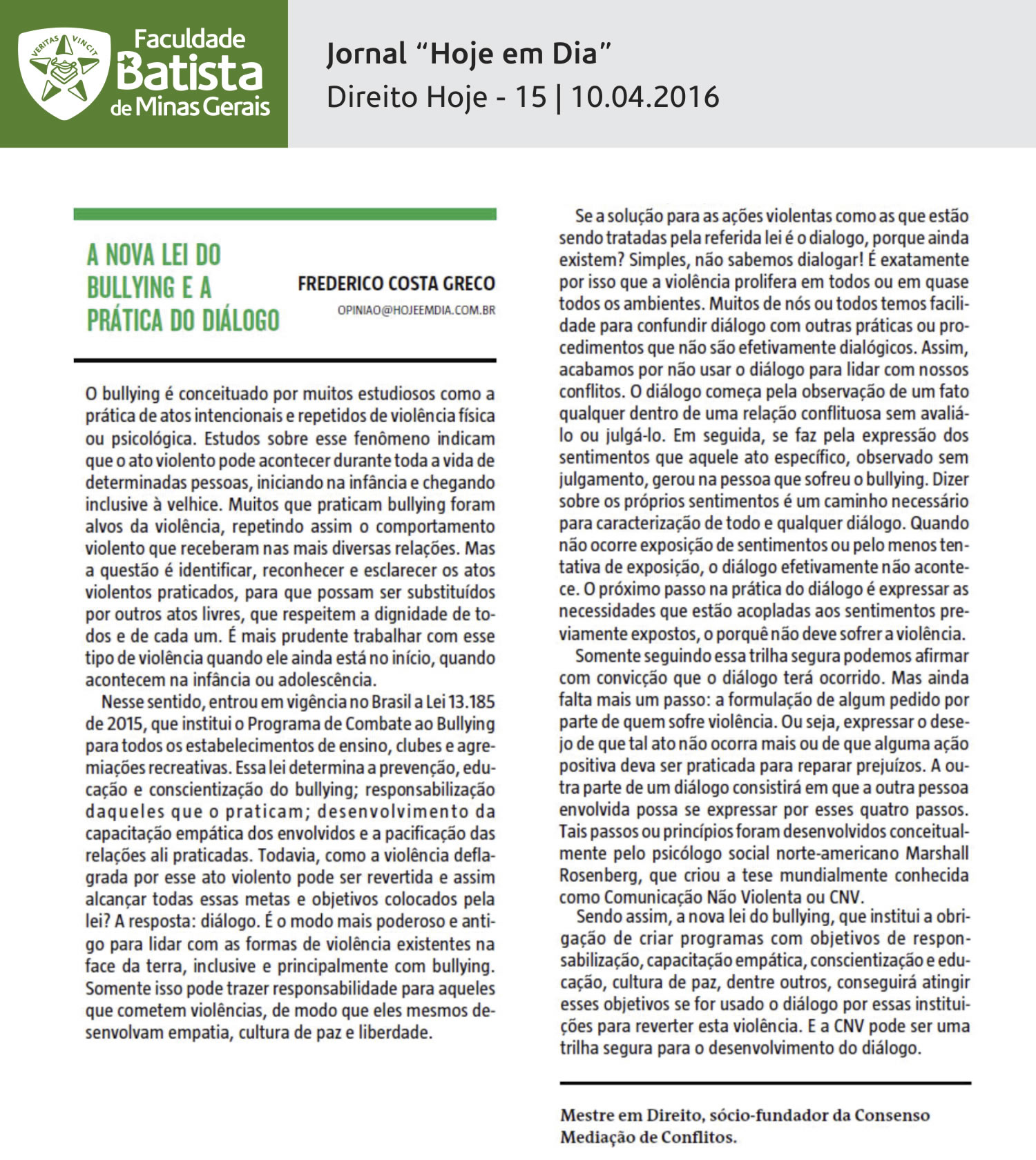 A nova lei do bullying e a prática do diálogo (Hoje em Dia)