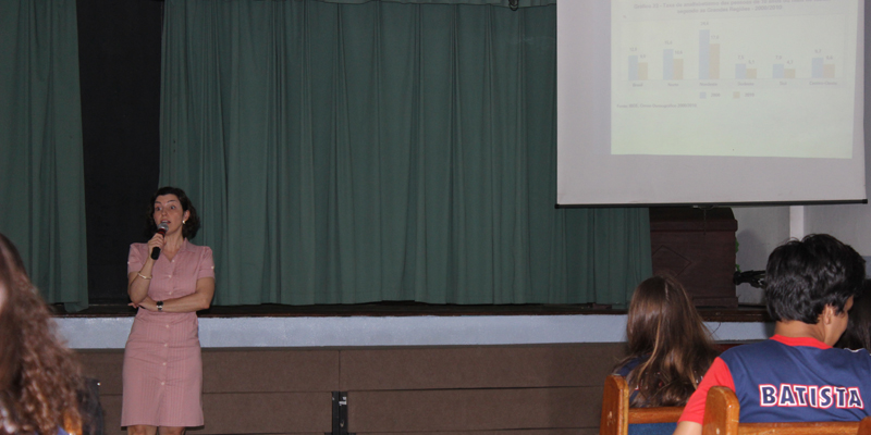 No dia 23 de outubro, o Colégio Batista Mineiro, recebeu a ex-aluna do Batista e representante do IBGE, Luciene Longo que realizou uma palestra para os estudantes do sétimo ano. No evento ela também abordou os temas contemplados no livro “o Brasil em números” lançado todos os anos pelo IBGE e que reúne informações que permitem traçar uma síntese da realidade brasileira em seus múltiplos aspectos.