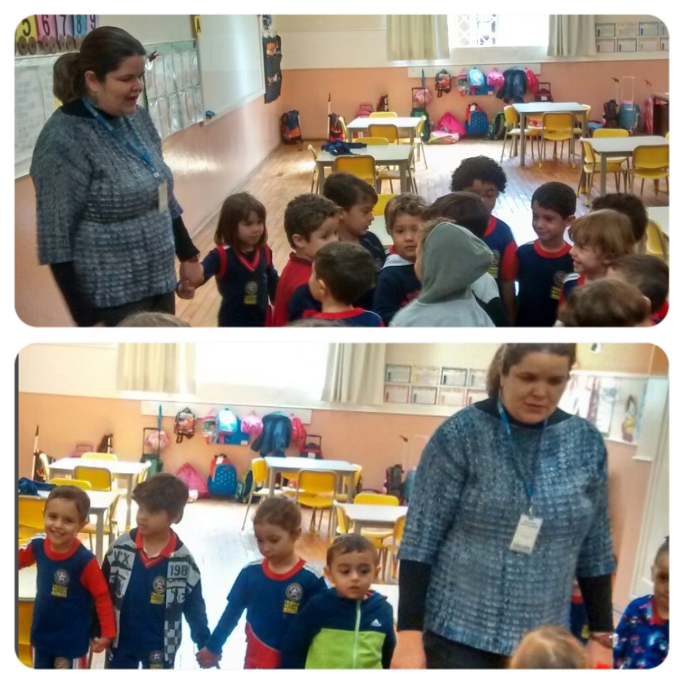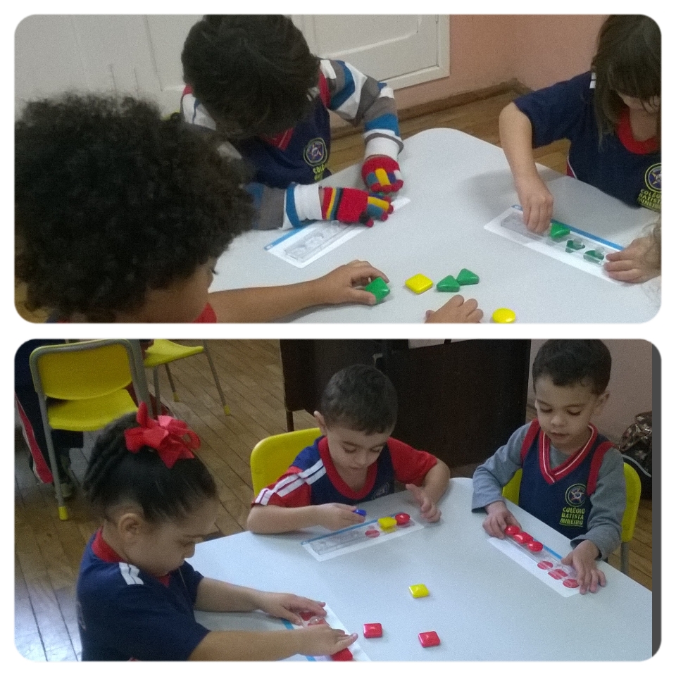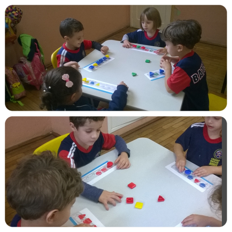 Na turma Centopeia e no 1º período os professores trabalharam com os alunos o conceito de seriação matemática fazendo uma roda para desenvolver o conceito de forma corporal, depois a sala foi dividida em grupos menores e os alunos usaram material concreto com formas geométricas para completar as séries das cartelas,