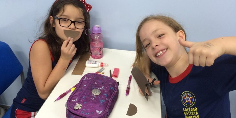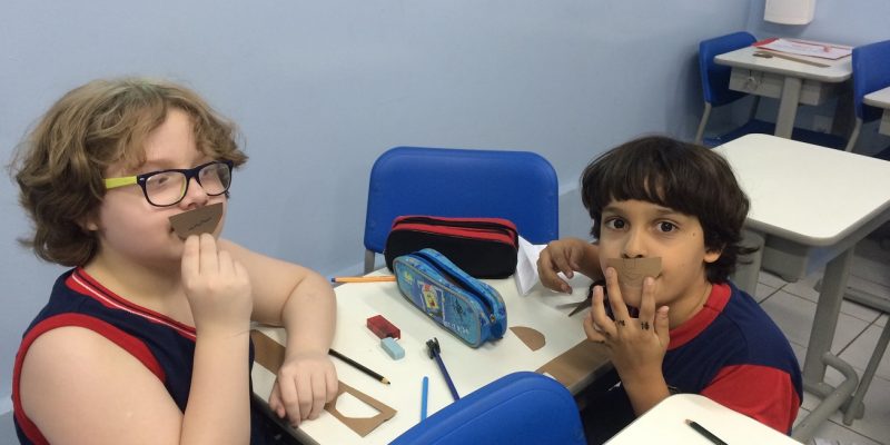 No último mês, ao aprenderem “emotions”, os alunos utilizaram toda sua criatividade confeccionando rostinhos alegres, tristes, com raiva etc. A aula foi muito divertida e os alunos puderam praticar o vocabulário e visualizar o que estavam estudando. A professora trabalhou o vocabulário por meio de palavras e frases simples com as quais os alunos puderam perguntar e responder em inglês como estavam se sentindo.