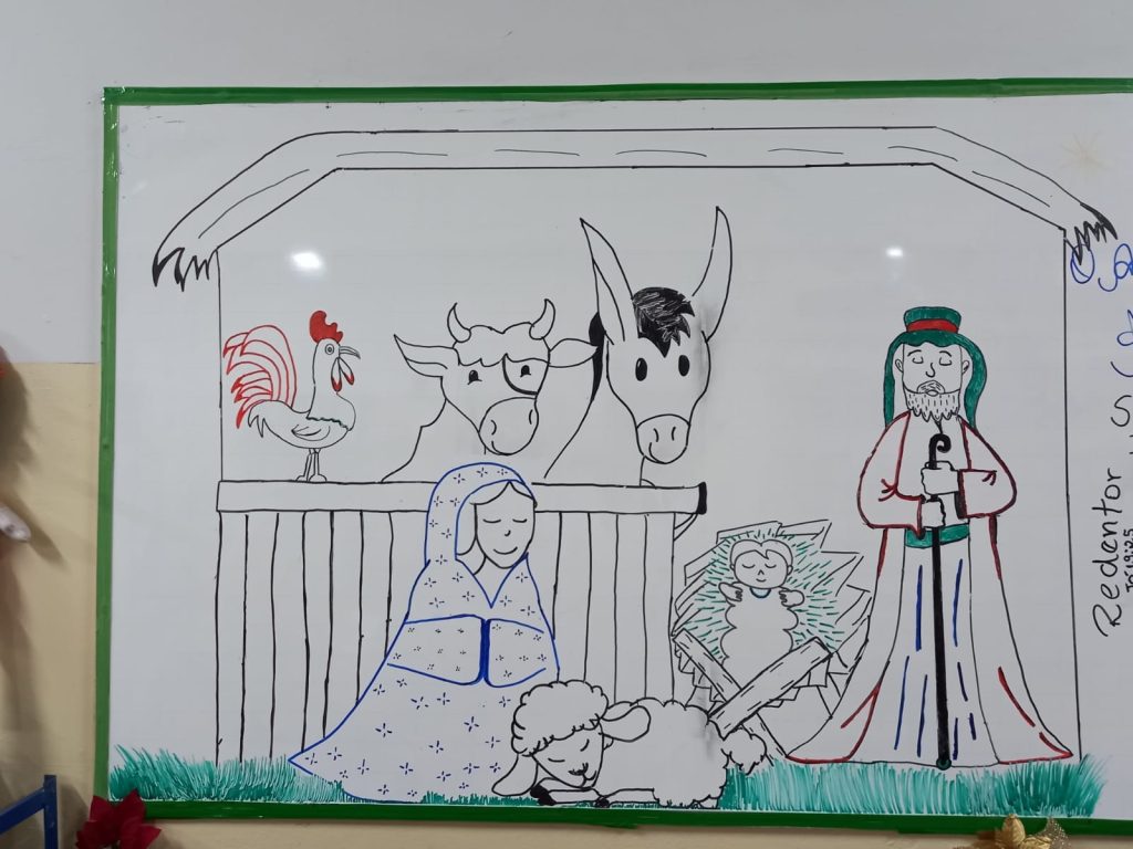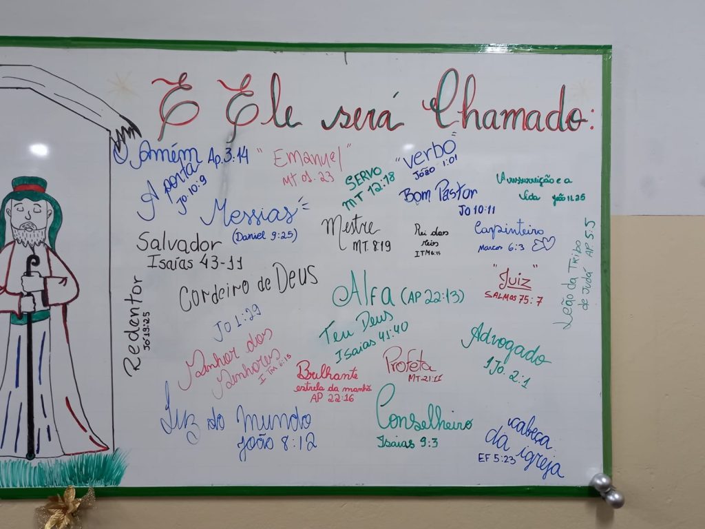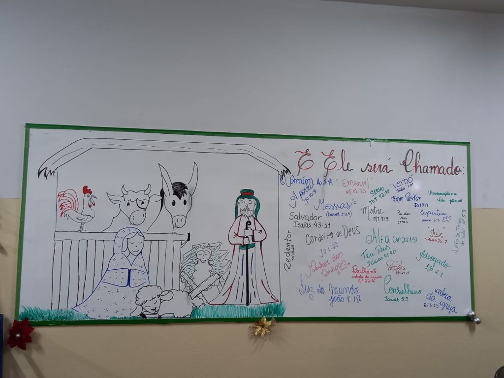 “Um livro é um brinquedo feito com letras. Ler é brincar”, disse Rubem Alves. Foi com essa frase que Maria do Socorro Martins Salles Soares, auxiliar de biblioteca, descreveu uma das suas inspirações para um projeto em que a arte e a literatura se encontram na Unidade Betim do Colégio Batista Mineiro. Ao perceber o talento dos estudantes para o desenho, Maria viu em um quadro vazio a oportunidade de unir o aprendizado dos livros à técnica da ilustração. A cada dois meses, os jovens alunos são convidados a colocarem a mão na massa no espaço da biblioteca a partir de uma temática proposta. Foi com esse convite que os alunos do 7º ano do Ensino Fundamental Ana Carla Borges de Oliveira e Emanuel Silva Vasconcelos fizeram ilustrações sobre o nascimento de Jesus Cristo e citaram passagens bíblicas que mencionam como ele seria chamado.