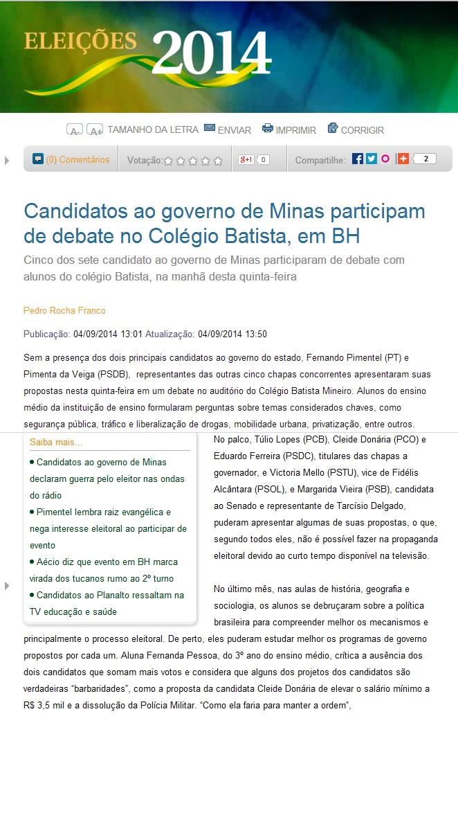 Candidatos ao governo de Minas participam de debate no Colégio Batista, em BH (Jornal Estado de Minas)