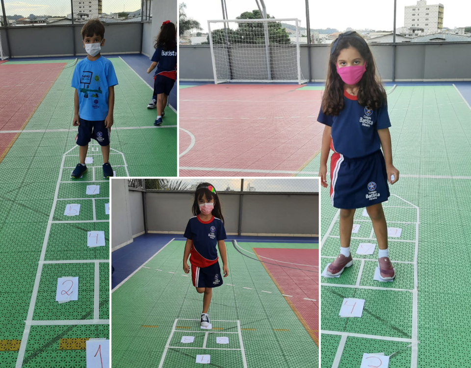 Em cada pulo, a criança pode desenvolver equilíbrio, agilidade, força e concentração, além de estimular a identificação de numerais relacionados com a quantidade.
