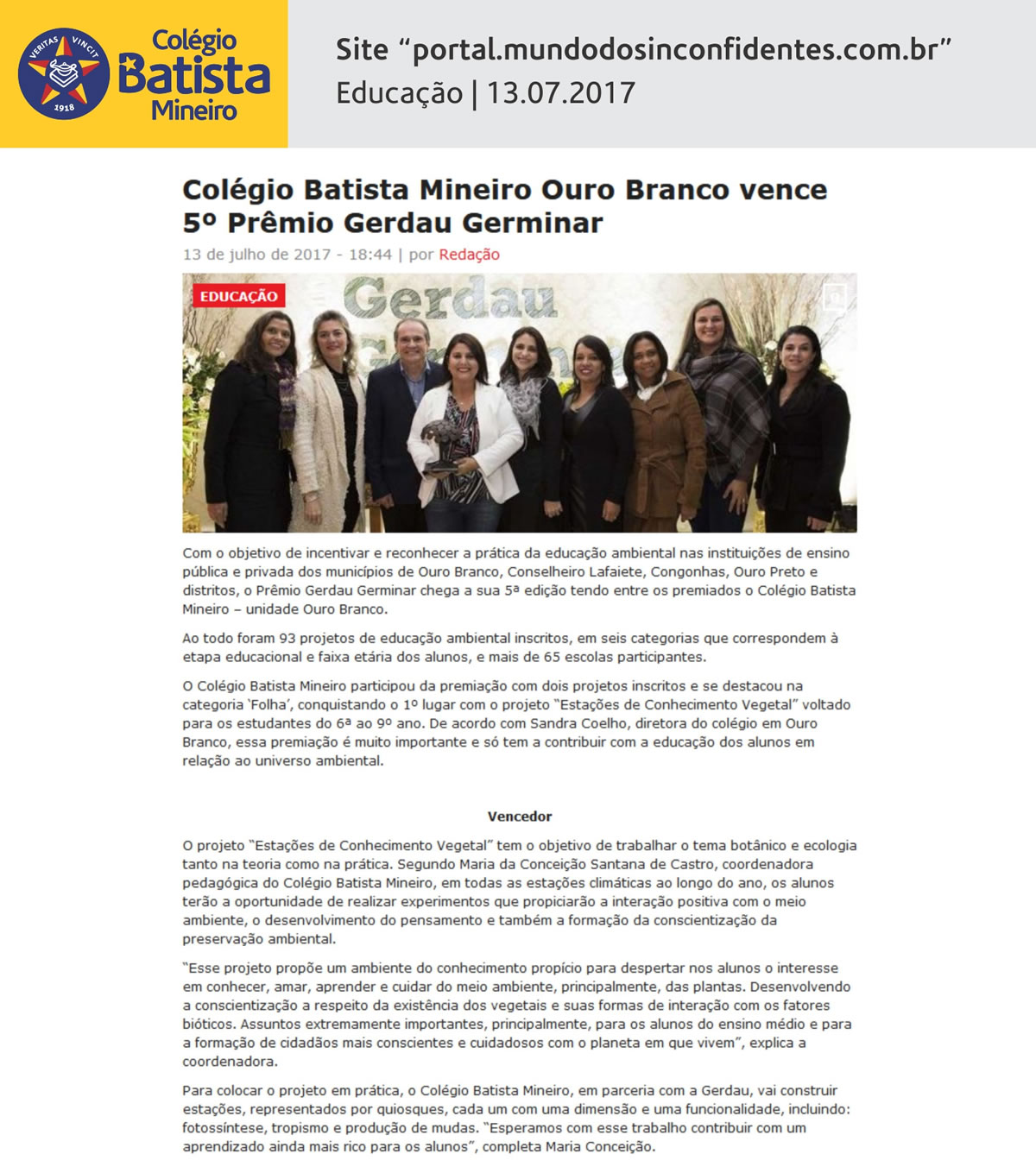 Colégio Batista Mineiro Ouro Branco Vence Quinto Prêmio Gerdau Germinar (Site portal.mundodosinconfidentes.com.br)
