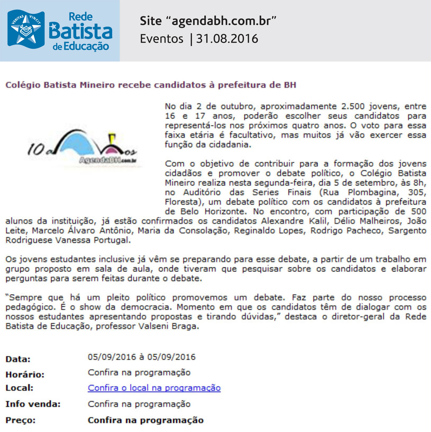 Colégio Batista Mineiro recebe candidatos à prefeitura de BH (Agenda BH)