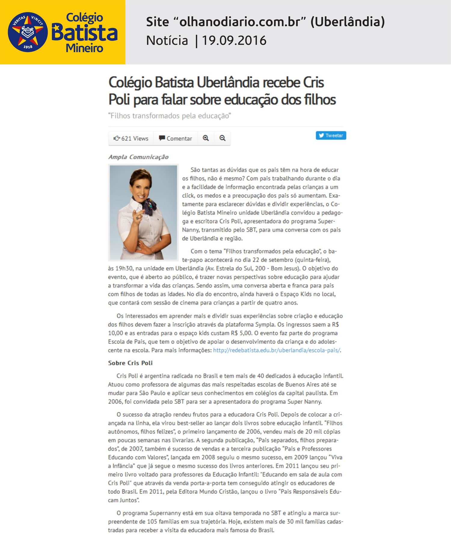 Colégio Batista Uberlândia recebe Cris Poli para falar sobre educação dos filhos (site ‘olhanodiario.com.br’)