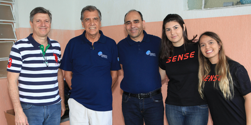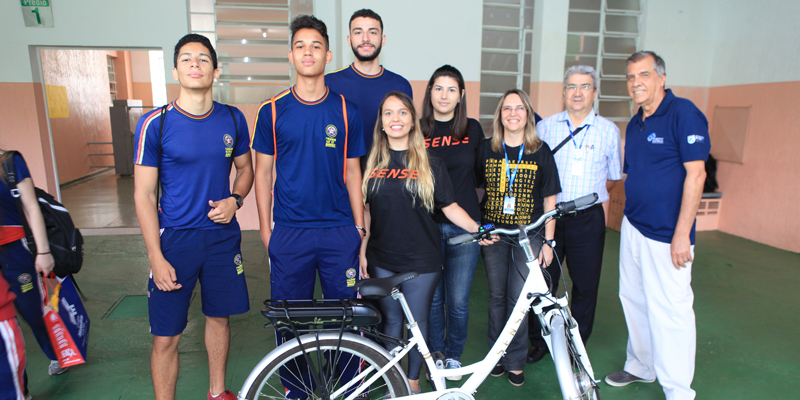 Uma dessas mostras exibiu uma bicicleta elétrica produzida pela Sense Eletrônica, empresa que atua no mercado de automação industrial, oferecendo soluções em sensoriamento e conectividade. O equipamento despertou a curiosidade dos alunos, e alguns tiveram a oportunidade de andar e se divertir pelo corredor entre o auditório e as quadras, que serviu de ciclovia. Angélica, monitora de Engenharia Elétrica da Sense, explicou com mais detalhes o funcionamento do veículo. “Ela possui uma bateria na traseira e um motor na roda dianteira, acionado por um sensor no pedal, que envia um comando e gera energia para manter o funcionamento. Se em algum momento o condutor parar de pedalar, a bicicleta corta a energia do motor, o que acontece também quando se aciona o freio”.