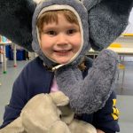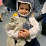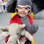 Educadora da Unidade Vila Mariana se veste de pelúcia de elefante na contação de história