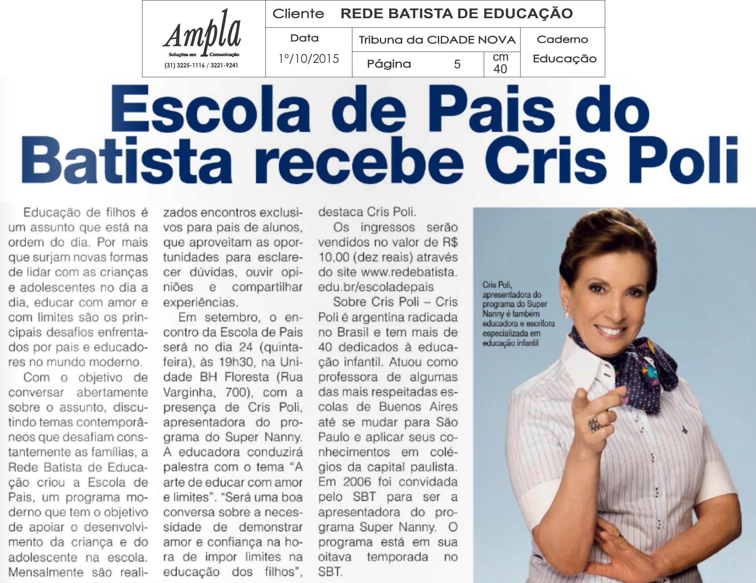 Escola de Pais do Batista recebe Cris Poli (Tribuna da Cidade Nova)