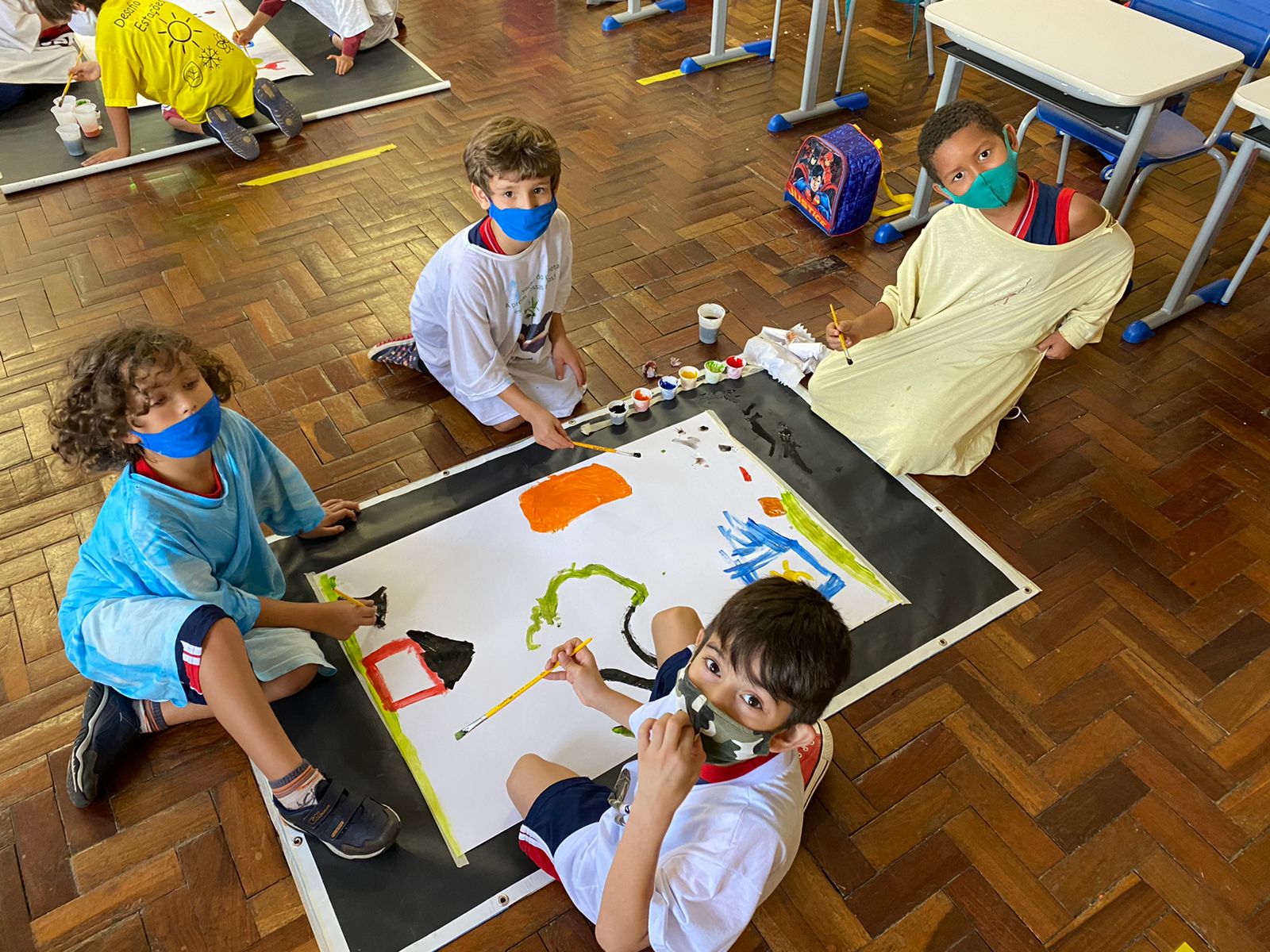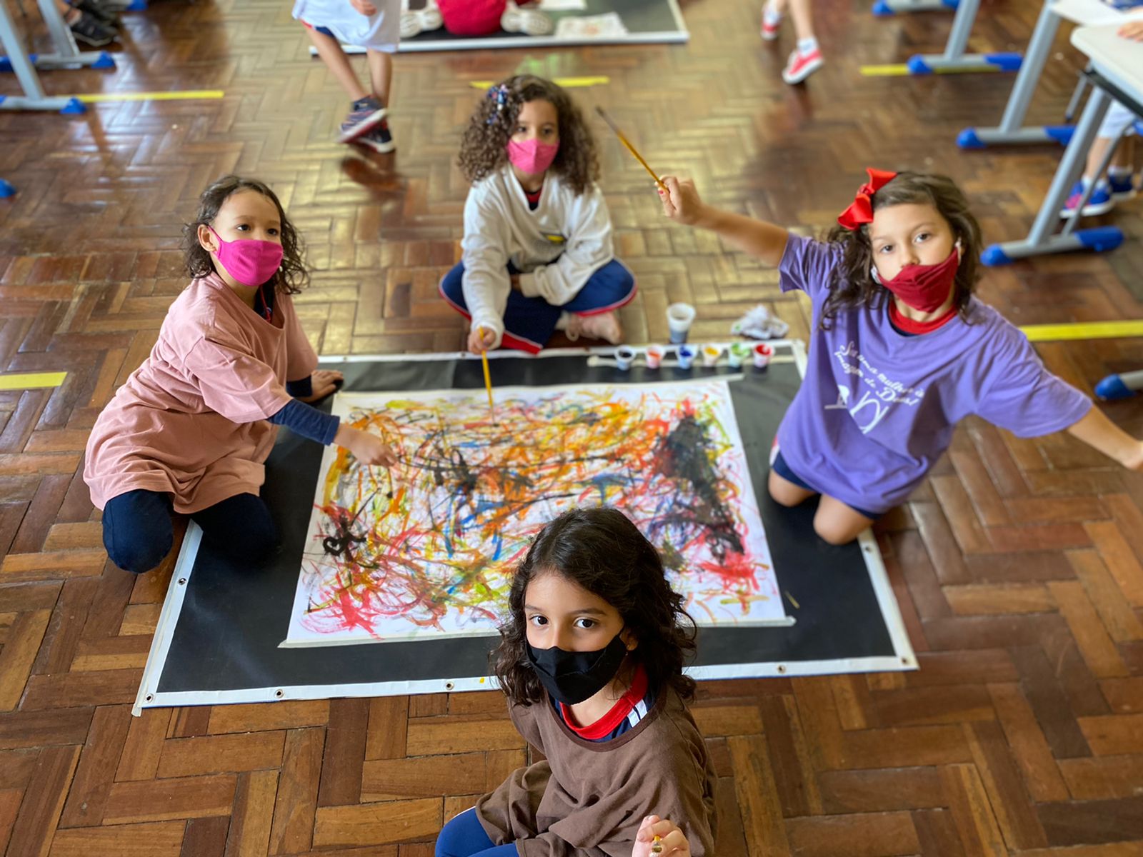 Ao som de música clássica e com papel kraft e muitas cores de tintas, as crianças se divertiram e deixaram a criatividade fluir. Segundo Joyce, o objetivo é desenvolver a habilidade artística, a concentração e a imaginação. “O intuito foi trazer ao conhecimento dos meninos as possibilidades das cores, dos movimentos abstratos, e conversamos sobre outros tipos de movimento dentro da arte. Misturamos todo o processo de conhecimento com a musicalização”, menciona.