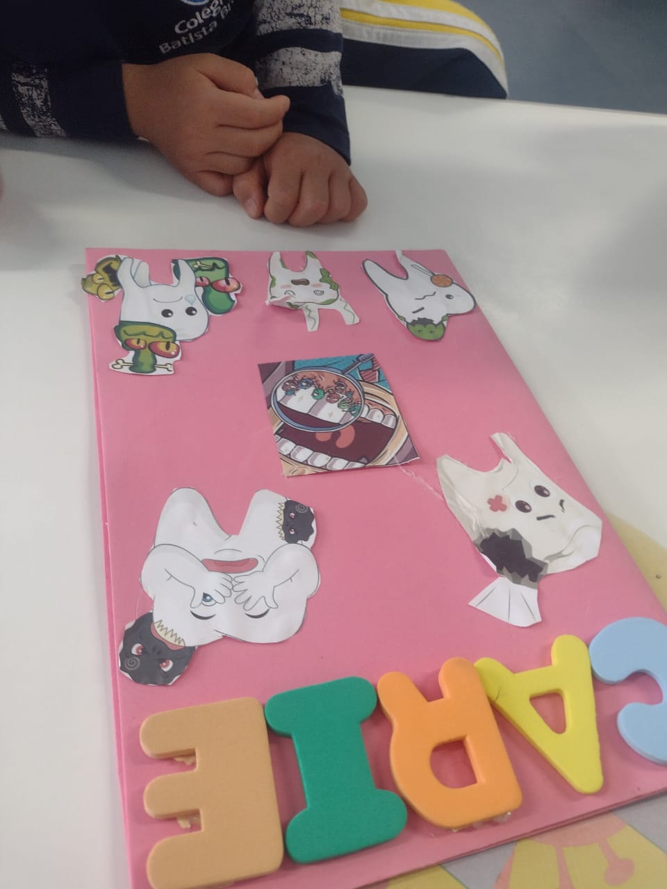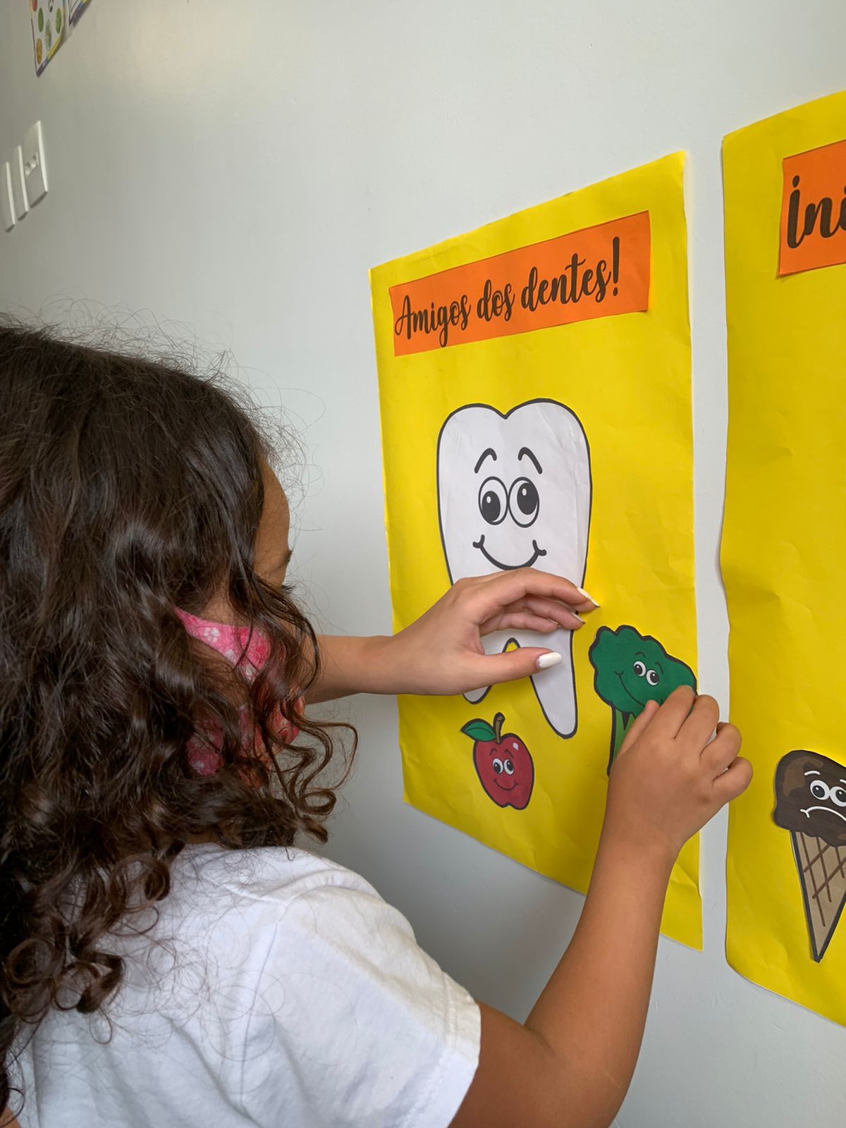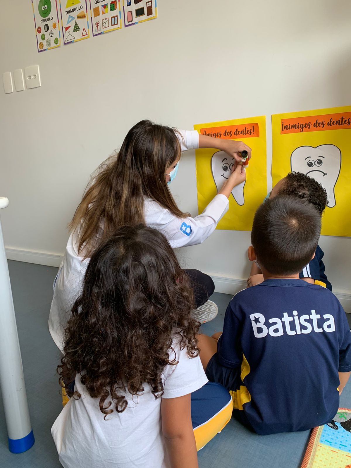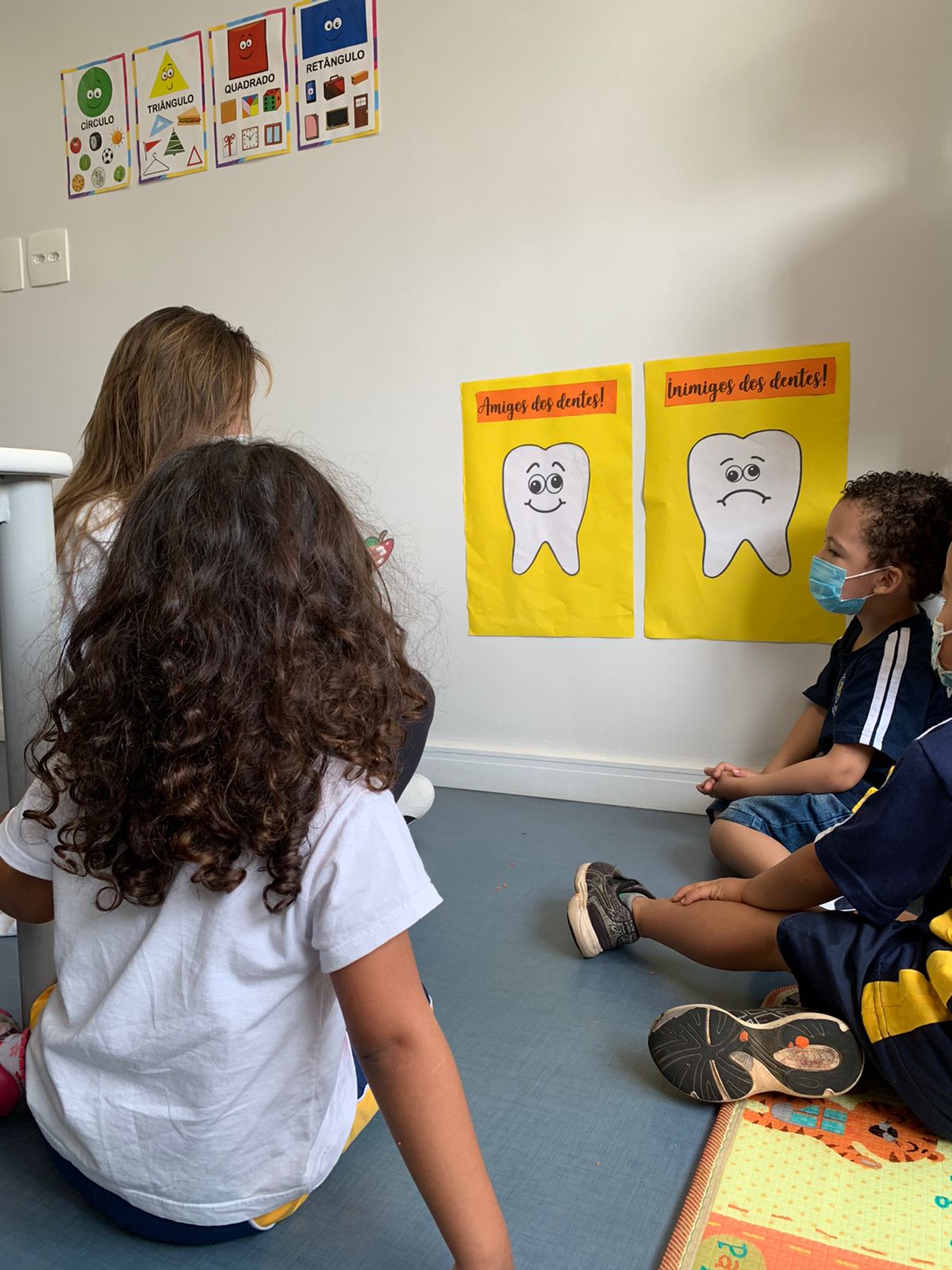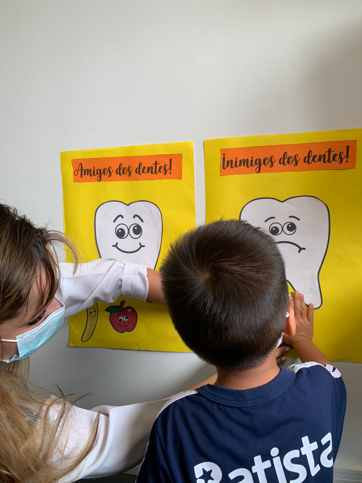Como o objetivo é aprender brincando, Fabíola fez uma roda de conversa com as crianças e começou a fazer perguntas como: “Quantas vezes você escova os dentes em casa?”; “Qual é a cor da sua escova?”; “Os doces fazem mal para os dentes?”. Em seguida, a professora fez a leitura do livro e mostrou um painel dos dentes com o tema “Amigos X inimigos dos dentes”. Falou ainda sobre os alimentos que possuem mais açúcar e o que ocasiona cáries e placas bacterianas.