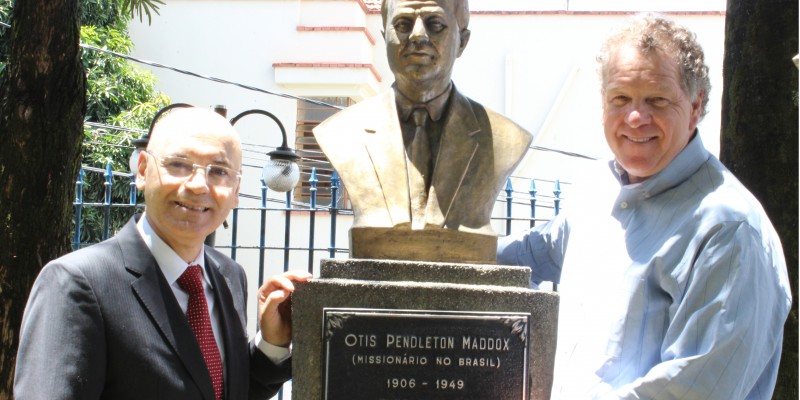 Em seguida, visitou as instalações do Colégio, fotografou junto ao busto do Pr Otis Maddox com o diretor-geral do RBE, Prof. Valseni Braga.