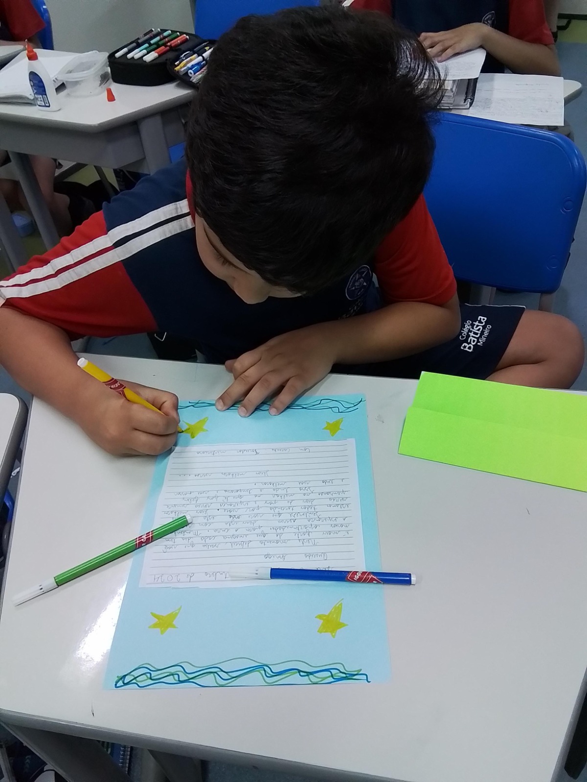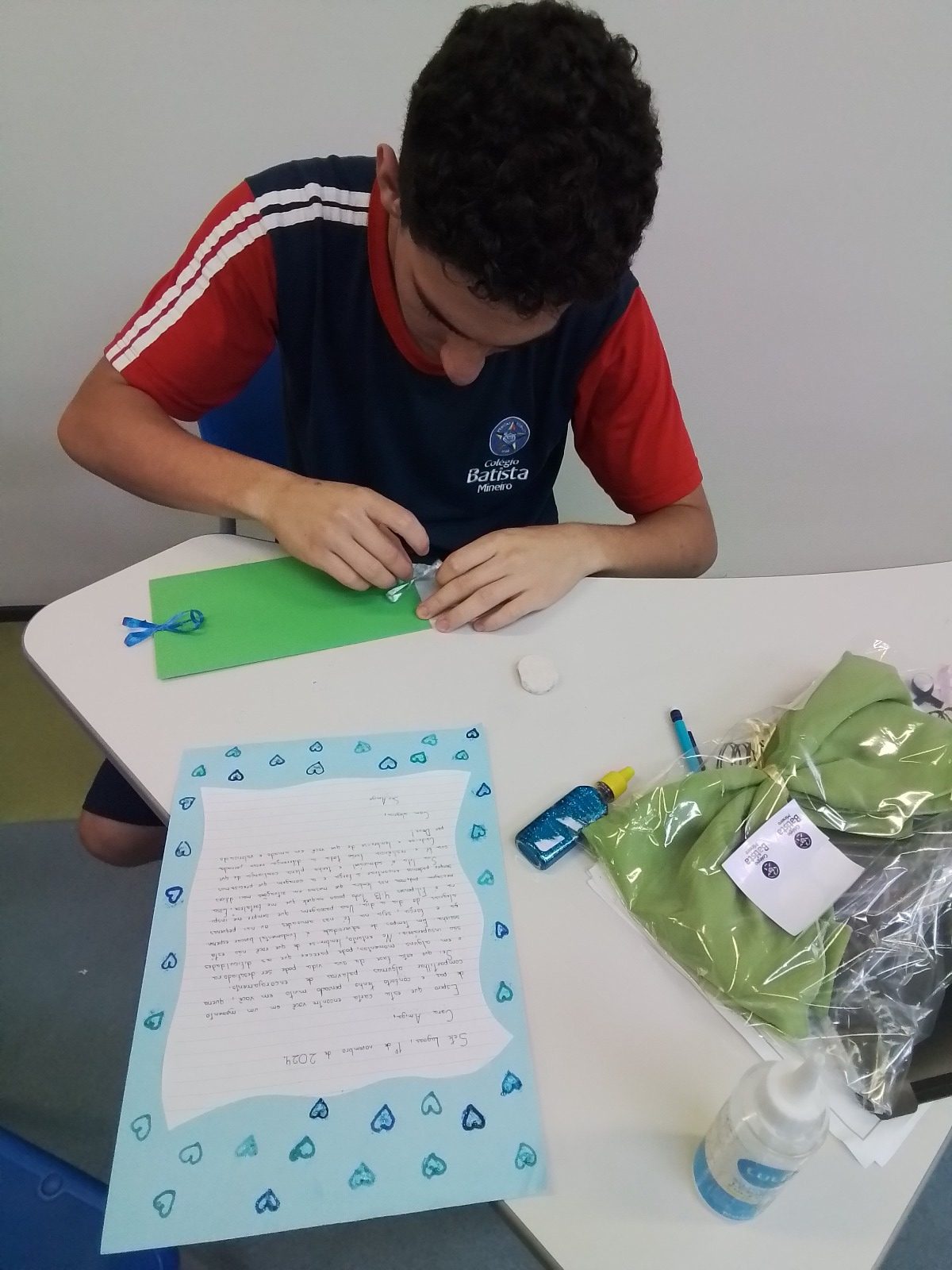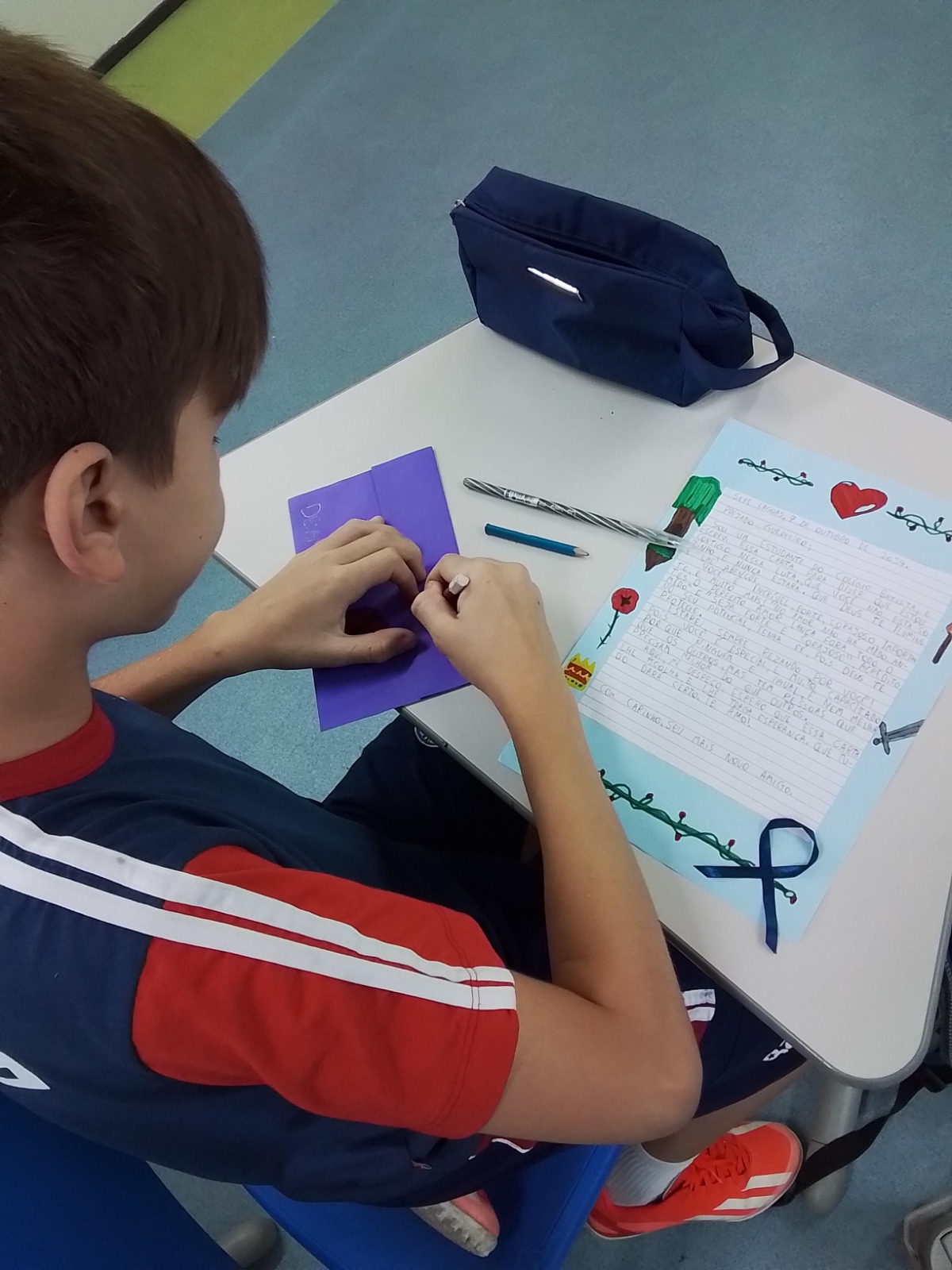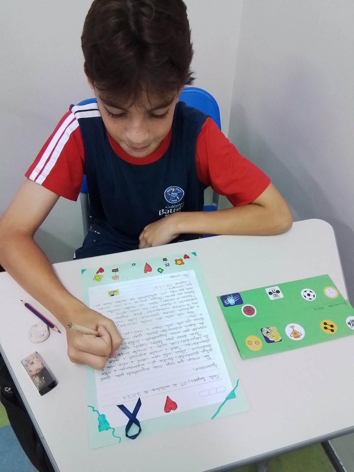 Já nos primeiros dias de aula do novo ano escolar, os estudantes das turmas do 6º ao 9º ano do Ensino Fundamental e da 1ª à 3ª série do Ensino Médio são apresentados a um resumo da atividade na qual serão protagonistas exercitando a solidariedade ao proporcionar amor e ao valorizar a fé por meio da escrita à mão de cartas motivacionais.