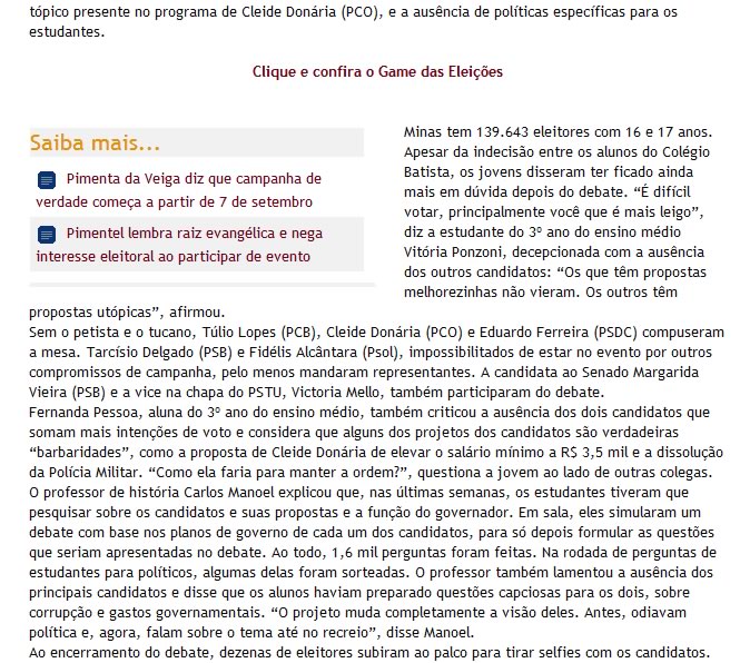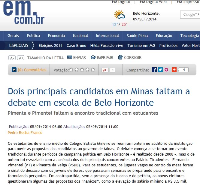 Dois principais candidatos em Minas faltam a debate em escola de Belo Horizonte (jornal Estado de Minas)