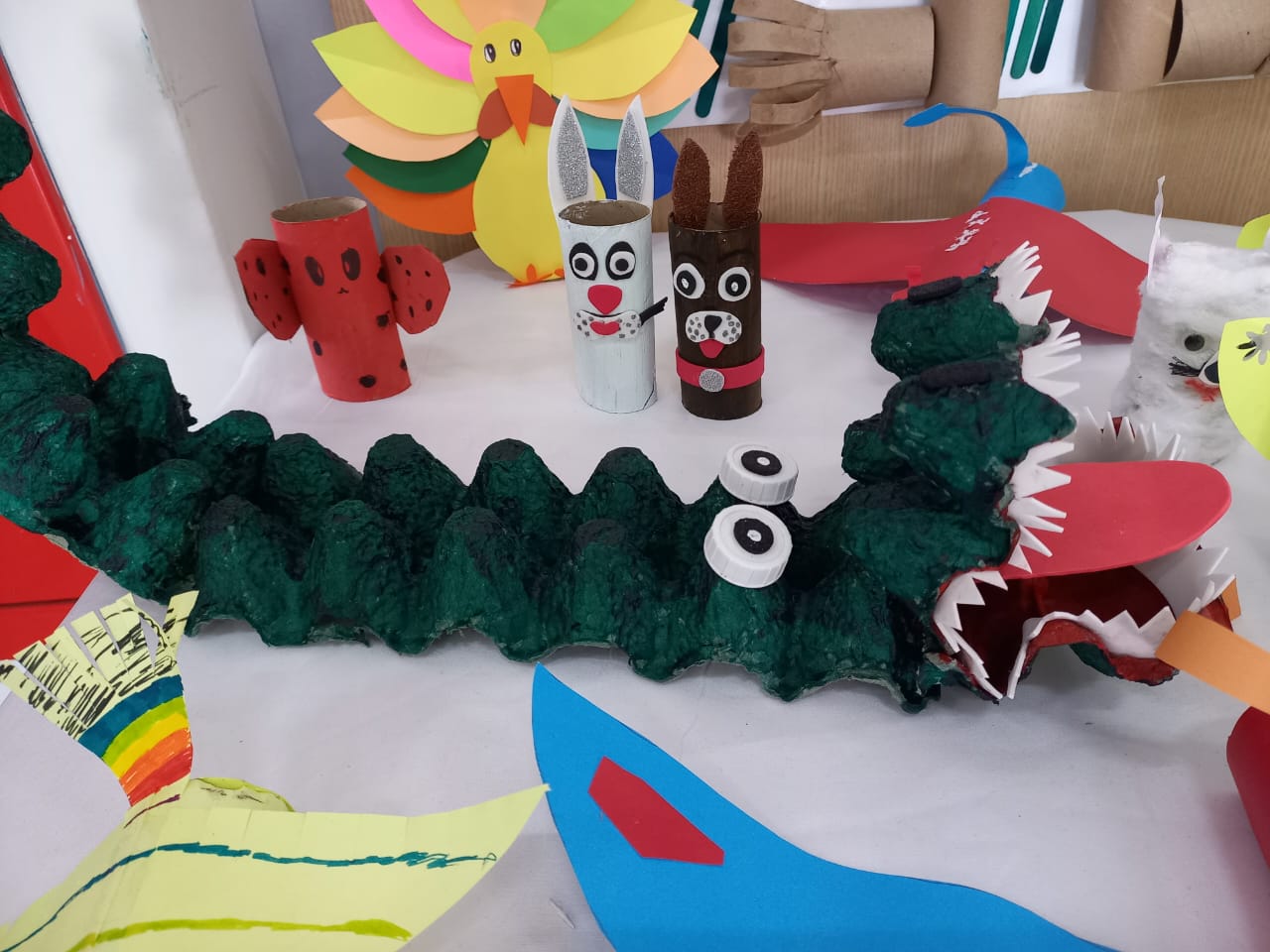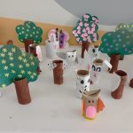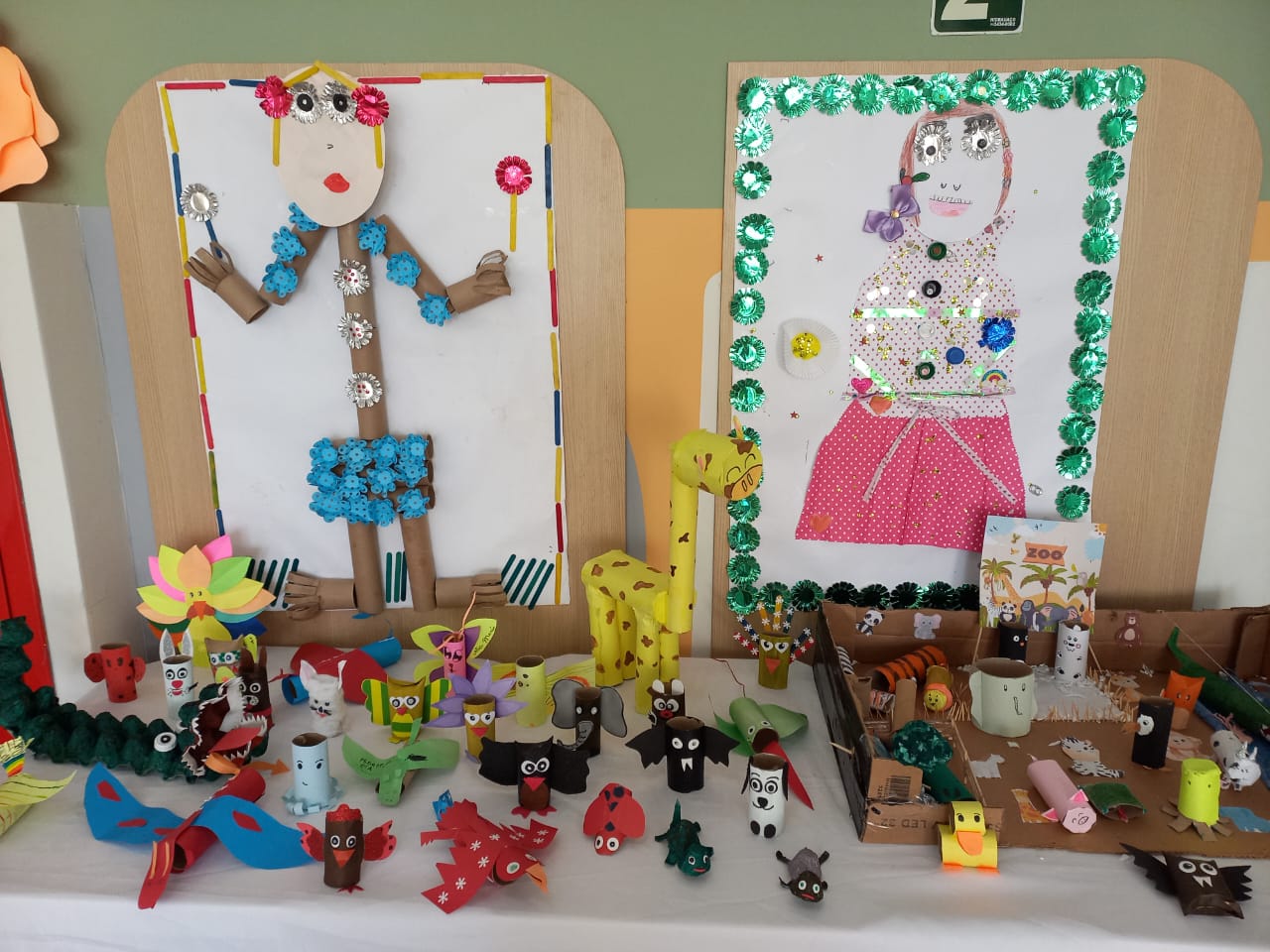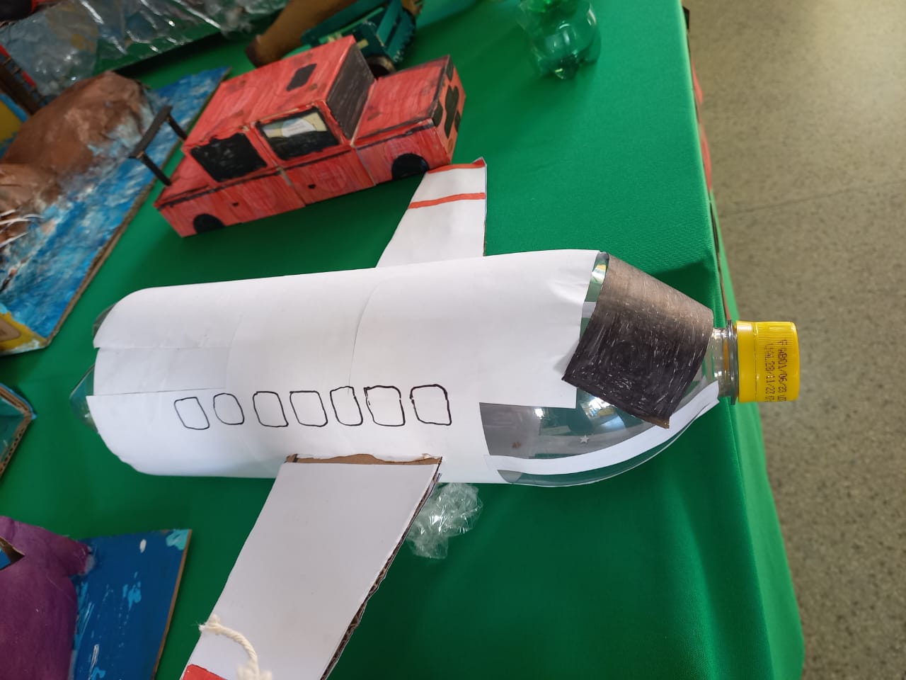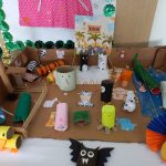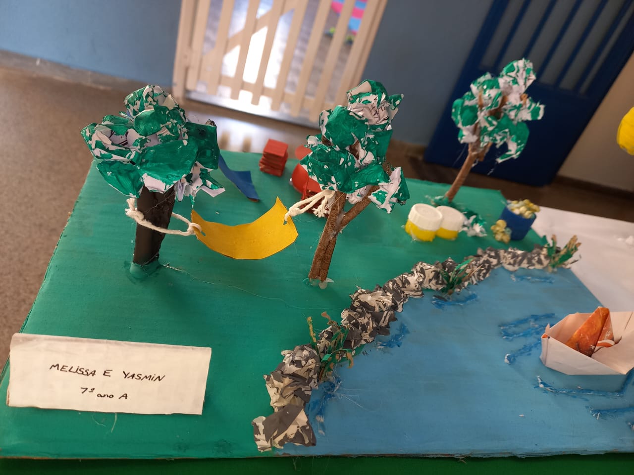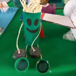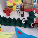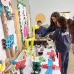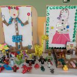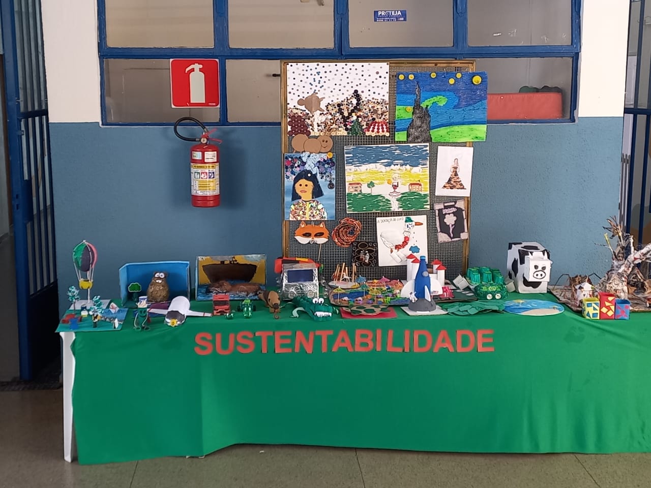 Os estudantes dos Anos Iniciais criaram brinquedos e animais reutilizando materiais descartáveis. Já nos Anos Finais, os estudantes criaram telas, esculturas, carros e animais, tudo isso com materiais reutilizáveis.