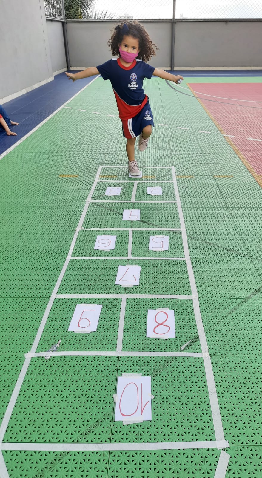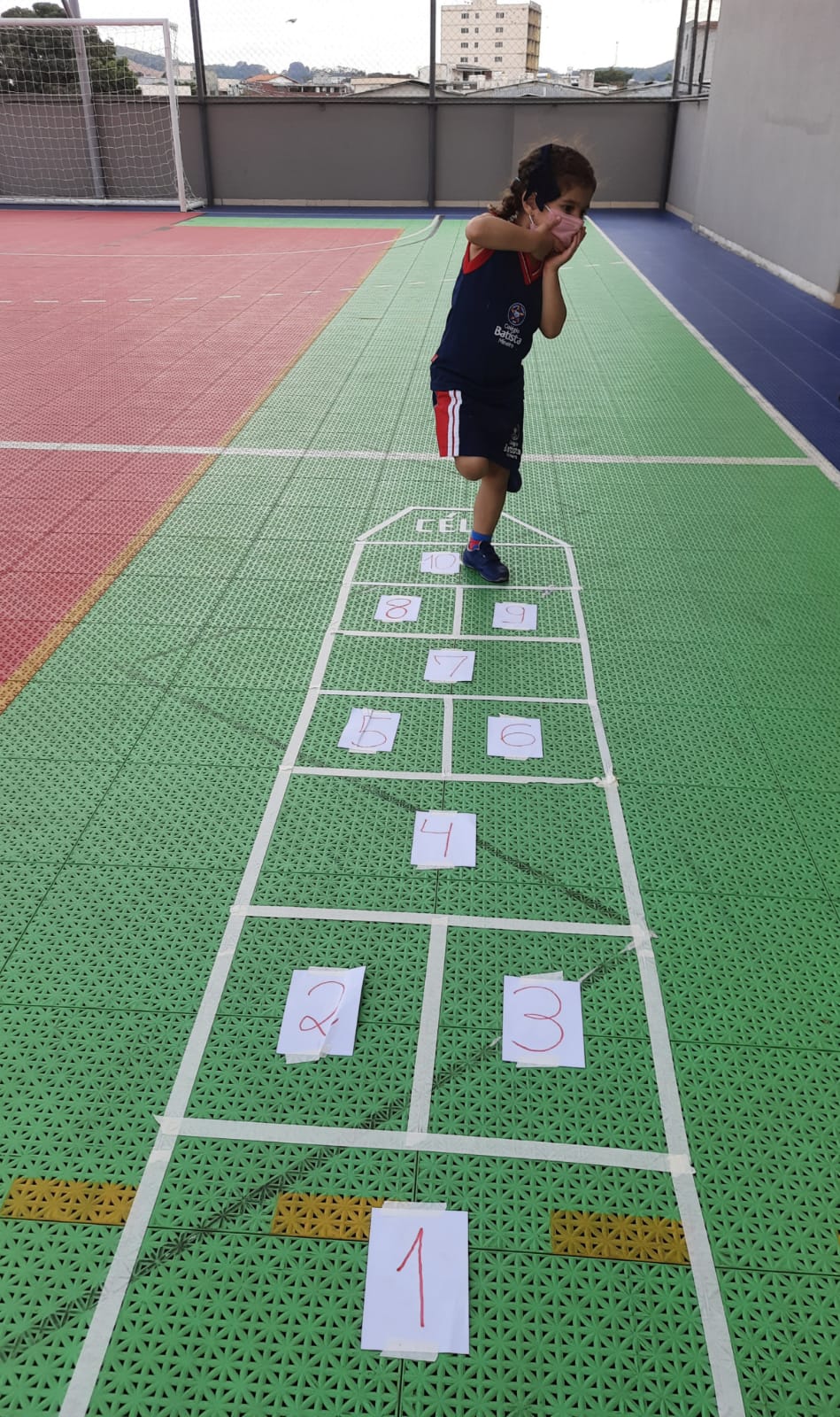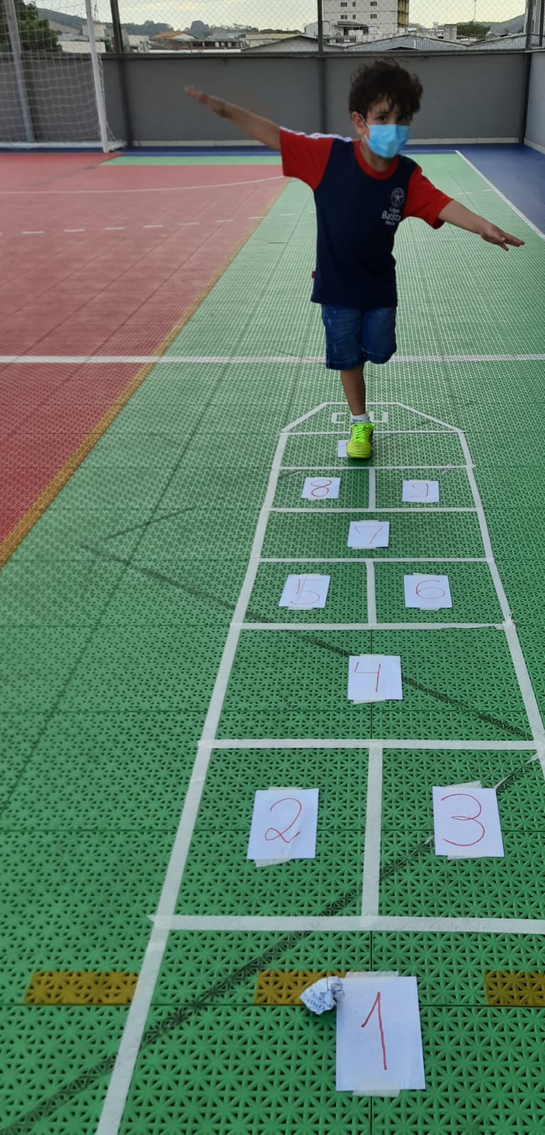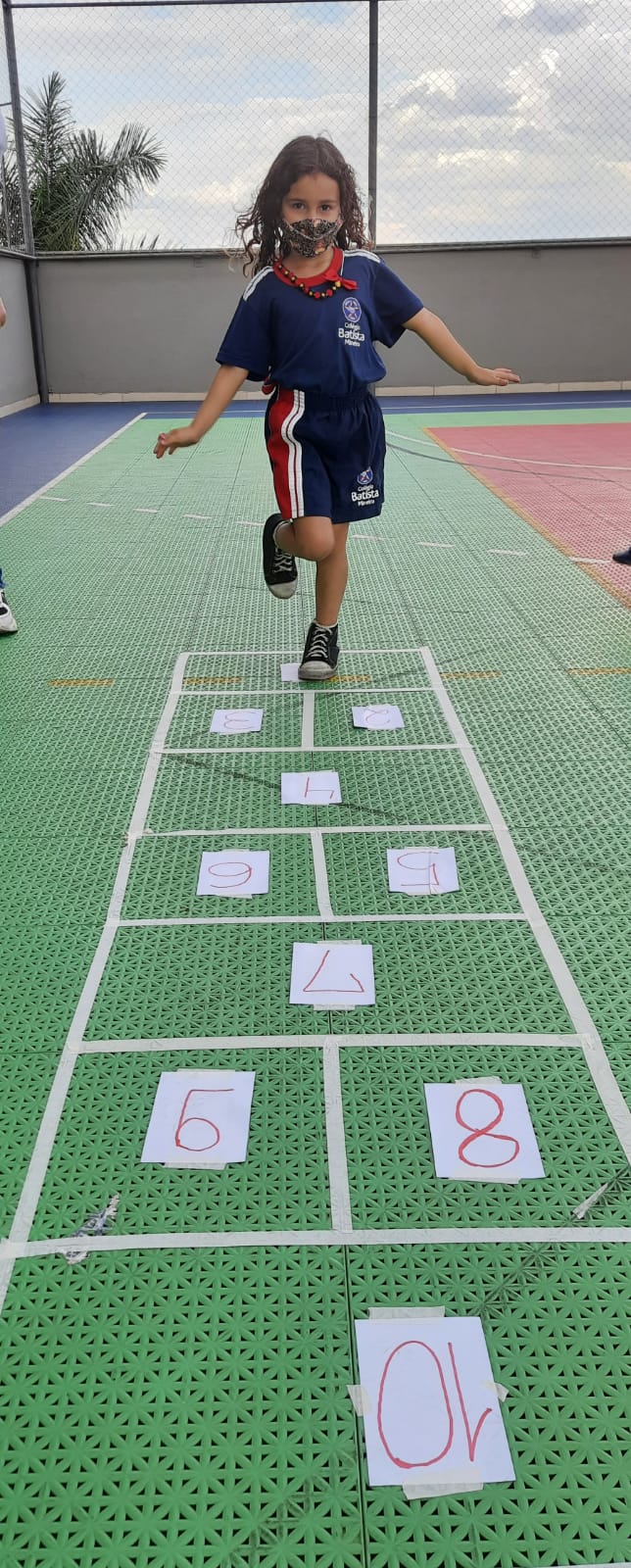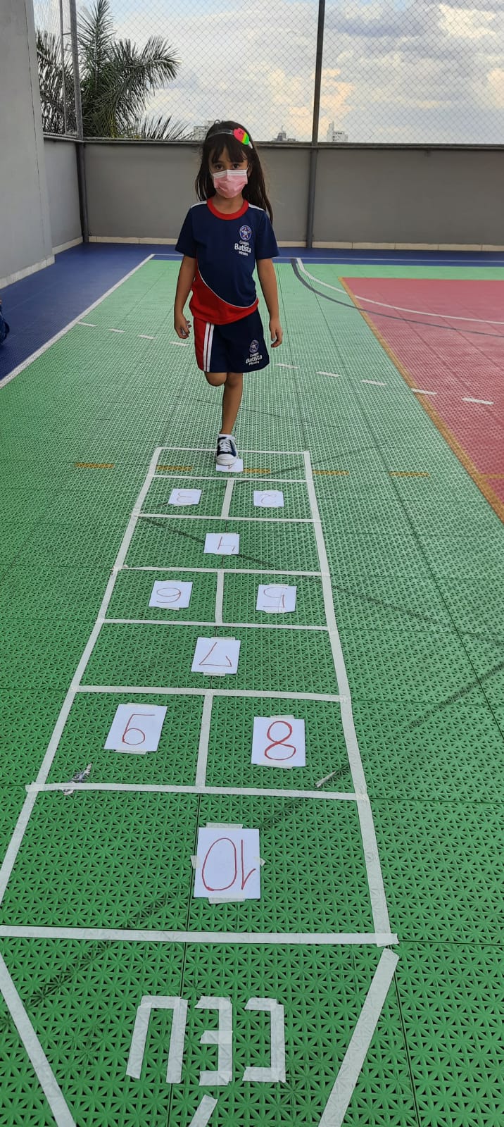 Em cada pulo, a criança pode desenvolver equilíbrio, agilidade, força e concentração, além de estimular a identificação de numerais relacionados com a quantidade.